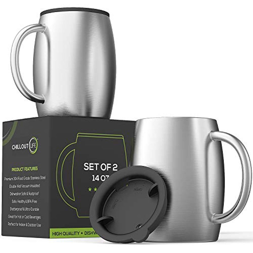 Stainless Steel Insulated Coffee Mugs Set of 2 (14oz) – Double Wall Coffee Cups With Spill Resistant Lid & Strong Handle – Portable Shatterproof Tumblers For Cold Drinks & Hot Beverages
