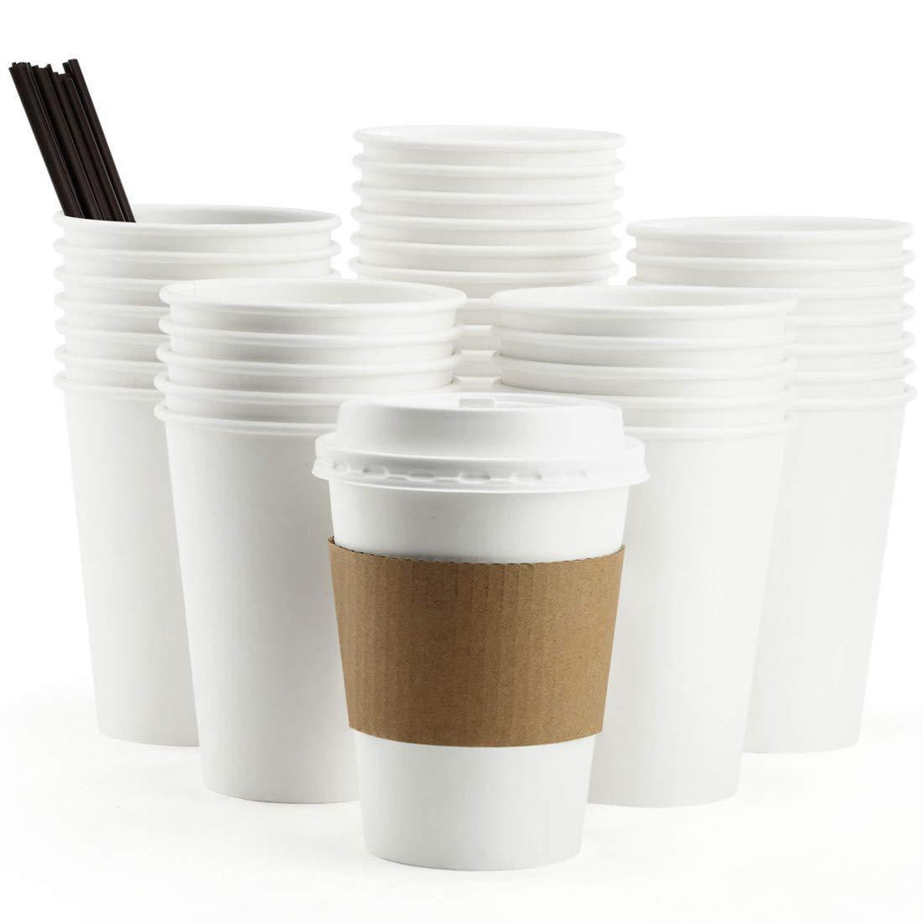 100 Pack 12 oz Disposable Hot Paper Coffee Cups with Lids, Sleeves and Straws to Go - White Drink Hot Cup from Eupako