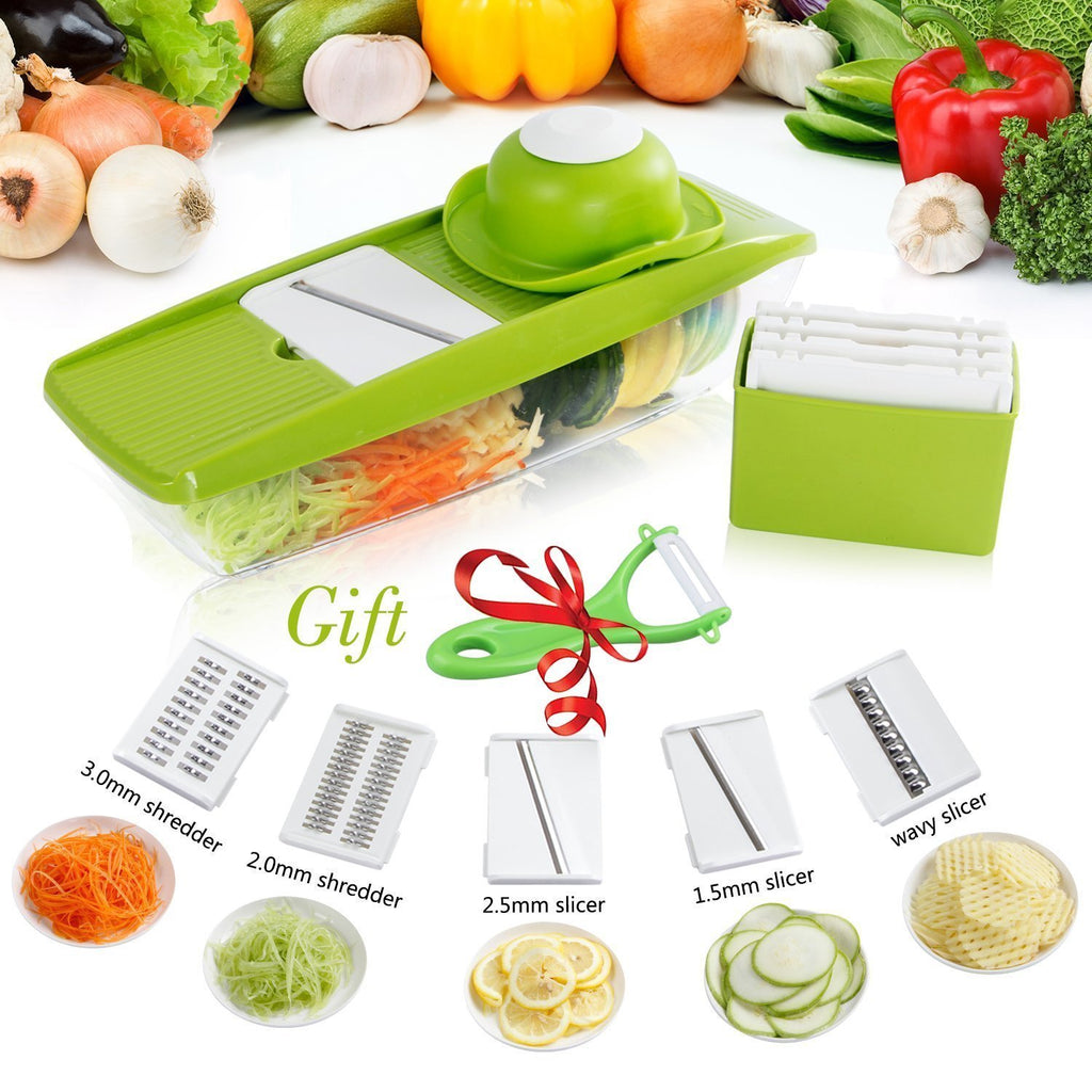 Mandoline Slicer - Premium Vegetable Potato Slicer Grater - Cutter for Tomato, Onion, Cucumber, Zucchini Pasta, Cheese - Julienne Veggie Peeler Chopper - Food Storage, 5 Blades & Hand Protector by Braviloni