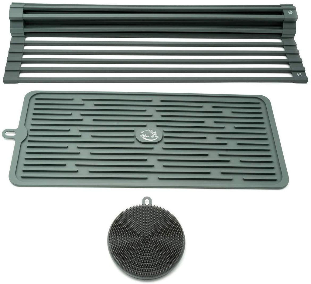 Miligore Multi Purpose Silicone Roll-Up Dish Drying Rack, Mat & Sponge Gift Set. Great for Multiple uses, Such as Washing Your Fruit & Vegetables for drip Drying. Easily drip Dry Dishes etc.