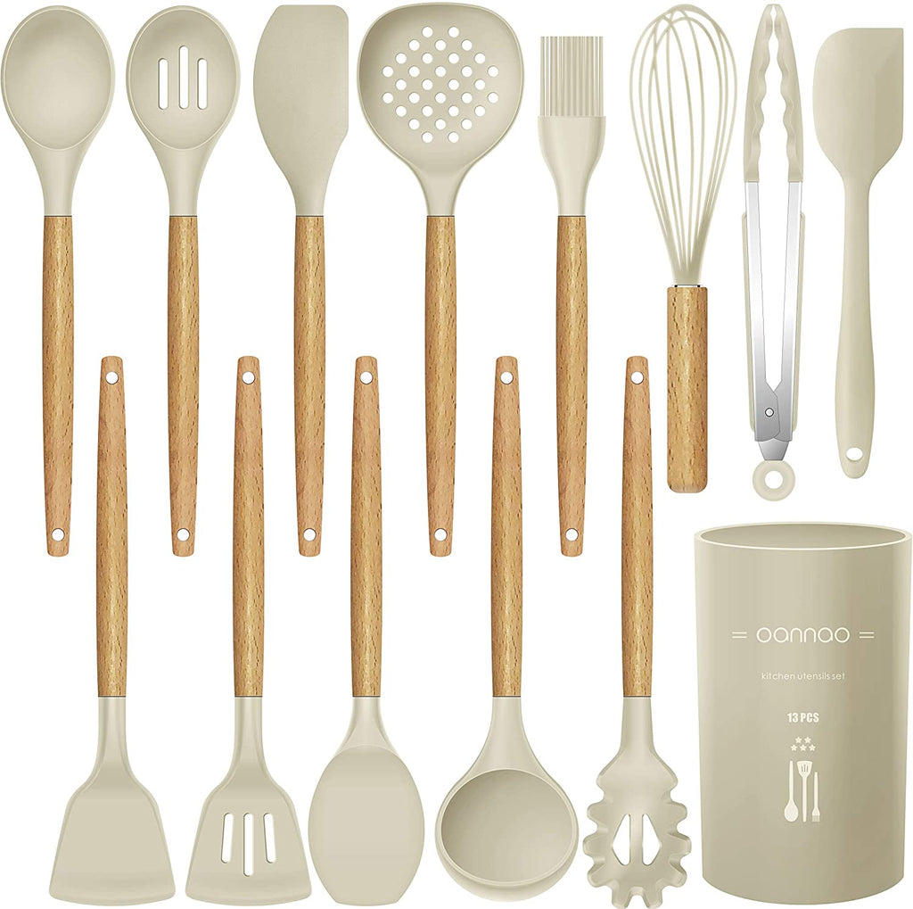 14 Pcs Silicone Cooking Utensils Kitchen Utensil Set, 446°F Heat Resistant,Turner Tongs,Spatula,Spoon,Brush,Whisk. Wooden Handles Khaki Kitchen Gadgets Tools Set for Non-stick Cookware (BPA Free)
