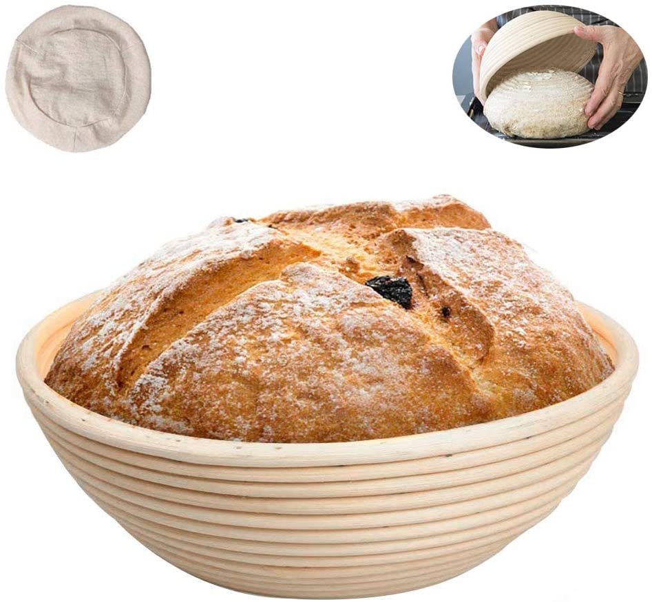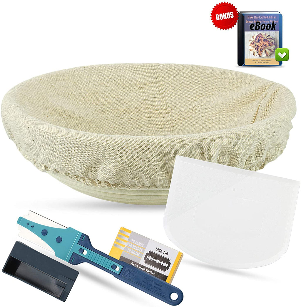 9 inch Round Banneton Bread Baking Proofing Basket Set with Natural Rattan Brotform, Cotton Liner, French Bread Lame Scoring Tool, 10-Pk Dough Blades, Flexible Bowl Scraper, eBook by XUANNIAO