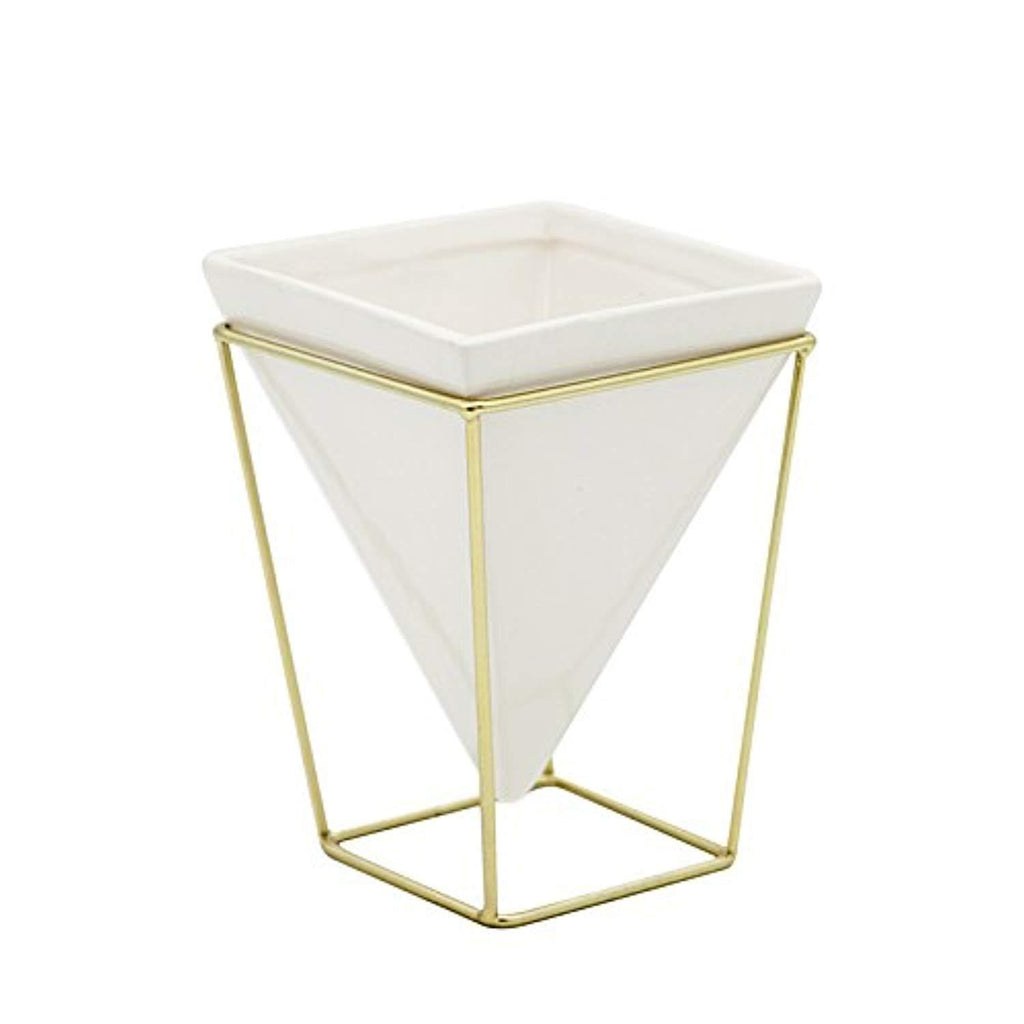 Purzest Modern Indoor Desktop Planter Vase,Ceramic Planter with Metal Stand(White + Gold)